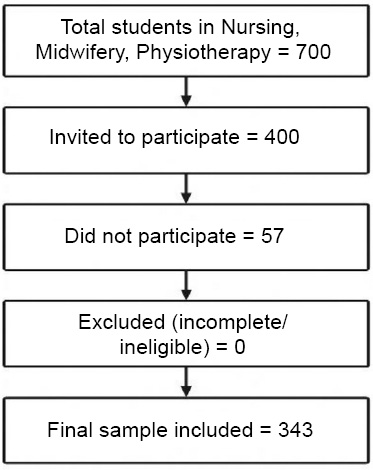 Data for this study were collected between January and February 2025 using a structured, self-administered questionnaire designed to assess patterns of smartphone use, dependence, and associated psychological and behavioral factors. From a total of 700 bachelor students enrolled in Nursing, Midwifery, and Physiotherapy programs at the Faculty of Health Sciences, University of Shkodra “Luigj Gurakuqi”, 343 students participated in this study (Fig. 1). A minimum sample size of 249 participants was calculated to ensure a 95% confidence level with a ±5% margin of error, indicating that the achieved sample size exceeds the minimum requirement for robust analysis.