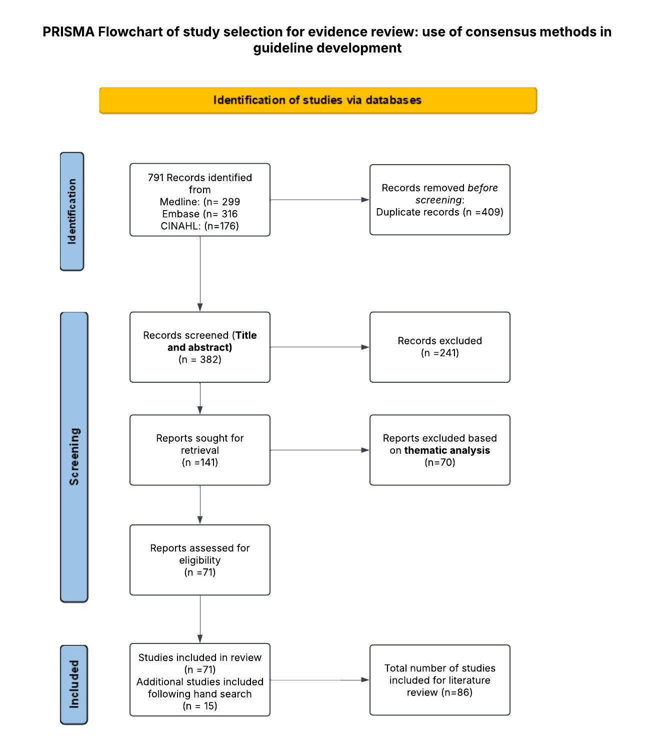 The original search was undertaken during June 2024 and repeated in December 2024 (S3). The project team identified a total of 791 potentially relevant records from a systematic search of Medline, Embase, and CINAHL, of which 409 duplicates were removed at this point. A total of 382 records were then screened in Rayyan [27] by title and abstract, with a further 241 excluded on the basis of incorrect outcome, population, study design, foreign language, or duplication. The remaining 141 records were subjected to full-text screening by two authors using Rayyan in blinded mode. A thematic analysis of full-text records was applied based on additional inclusion criteria that considered consensus articles reporting on the risk of bias in group decision-making, ensuring transparency in the process, systematic methods adopted, and a comprehensive perspective in decision-making. [28] Of these, a further 70 records were excluded, leaving 71 remaining. A hand search also yielded a further 15 records, therefore, a final total of 86 records were included in the review. [See Preferred Reporting Items for Systematic Reviews and Meta-Analyses flow diagram (PRISMA) Fig. (1).