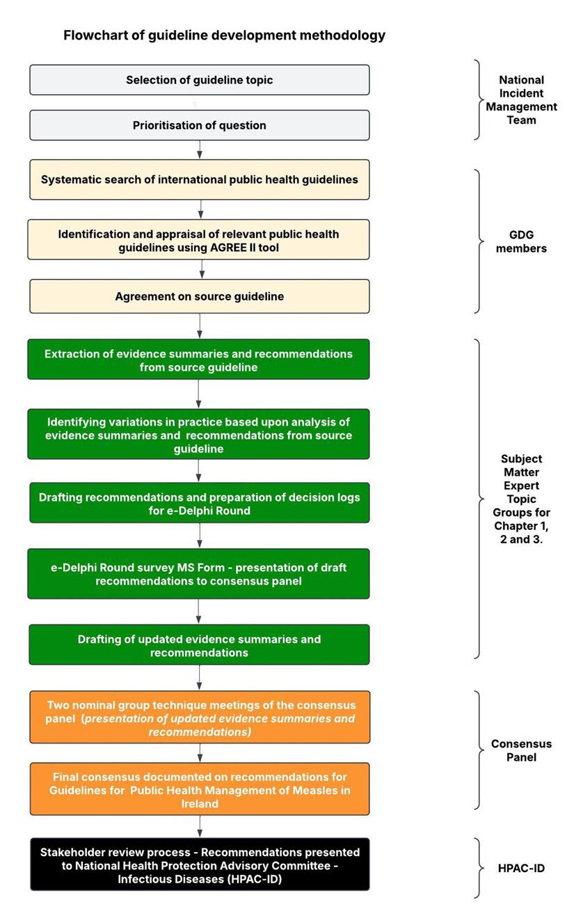 Members were recruited to the GDG via email by the National Measles Incident Management Team (N-IMT), a collaborative national structure convened by the Director of National Health Protection in response to the measles threat in early 2024. Members had experience, knowledge, and skills in evidence-based medicine and guideline development. The national RGDU provided methodological oversight and project management support throughout the process. The consensus panel, derived from GDG membership, played a significant role in developing the guideline through agreement on recommendations based on summaries of evidence.