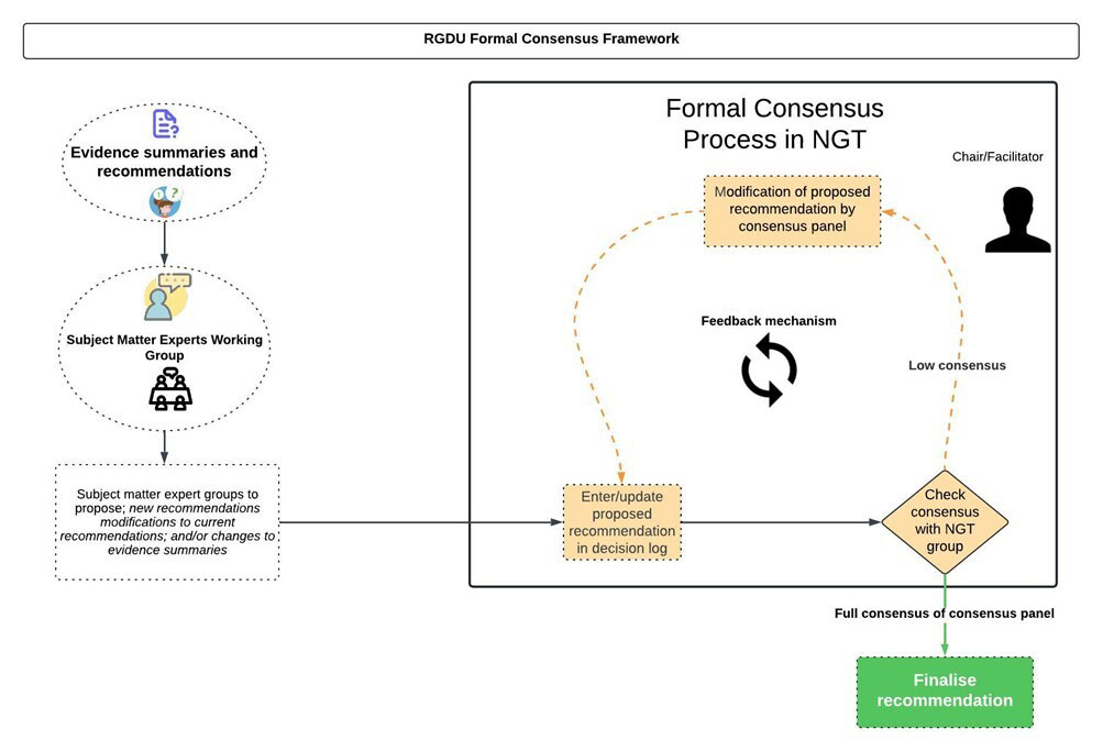Recognizing the limitations of informal consensus methods, formal consensus methods have been promoted to provide systematic and transparent support for group decision-making, reduce potential biases, and ensure equal opportunities for engagement among all members . [14] Formal consensus methods are considered a suitable approach to address the aforementioned complexities, and to support the adaptation and adoption of public health guidelines in Ireland when situated within a structured and transparent framework . [15] Although it is theoretically understood that consensus models are typically iterative, it is strongly recommended that this approach be situated within an evidence-based framework . [16] The RGDU has adopted the “GRADE-ADOLOPMENT” methodology for this purpose, and this framework is endorsed by organisations including the WHO, ECDC (European Centre for Disease Prevention and Control), and NICE.