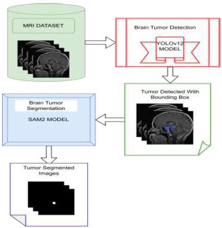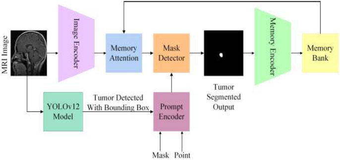 Our proposed model combines two cutting-edge algorithms, YOLOv12 and SAM 2, to efficiently identify and segment brain tumours in MRI images. Initially, the YOLOv12 model detects the location of tumours and encircles them with bounding boxes. Subsequently, these bounding boxes are used as input prompts for the SAM 2 model, which accurately segments the tumour using the given bounding box coordinates (Fig. 1). A pre-trained YOLOv12 model is used for tumour detection. This model is selected for its remarkable accuracy and speed performance, especially in real-time applications.