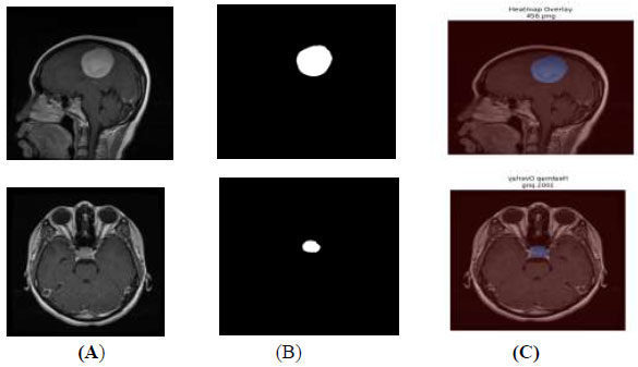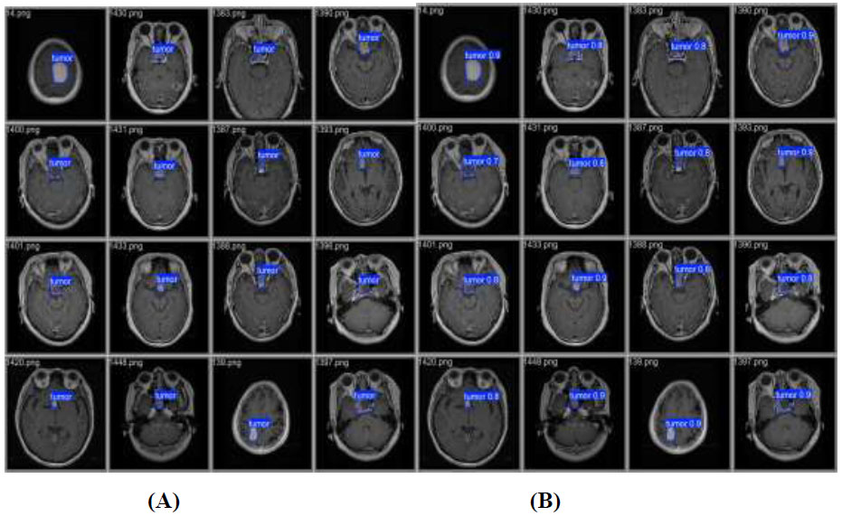 The dataset used in this study was the publicly available Brain Tumour MRI Figshare dataset, originally hosted on FigShare and also available on Kaggle for accessibility [25]. It contains 3,064 T1-weighted contrast-enhanced MRI images and their corresponding binary masks. The image size of the MRI dataset was 640×640. The dataset was divided into 2,451 training images, 307 validation images, and 306 test images. For visual inspection, a random selection of MRI images was chosen, as shown in Fig. (2A), to guarantee the consistency and high quality of our data. Fig. (2B) shows these images superimposed with the corresponding ground-truth masks. This step is crucial to verify that the MRI images and ground-truth masks are properly aligned for training our prediction model. Annotation text labels are required to train YOLOv12; therefore, the binary masks were converted to label.txt files for training YOLOv12.