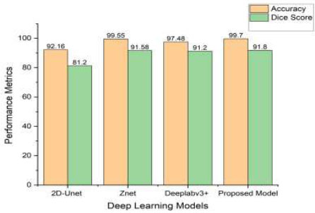 Compared with state-of-the-art models, the proposed model outperforms in terms of segmentation accuracy and the Dice score.