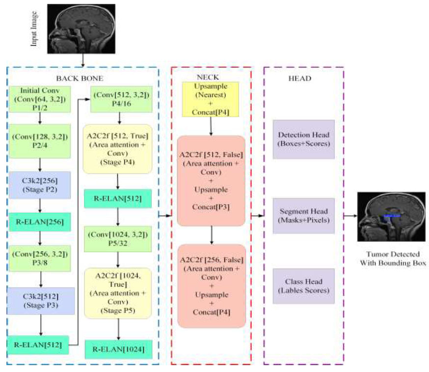 · In this work, the YOLOv12 model is used to detect tumour regions with bounding boxes. Then the bounding boxes are used to guide SAM 2 in segmenting the tumour within the localized area only. This type of targeted segmentation method allocates computational resources to the more important regions, thereby making the model both efficient and accurate.