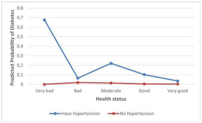 The interaction between health status and hypertension reveals a highly significant and strong effect for men with “very bad” health status and hypertension (β = 14.6849, p-value < 0.0001). The estimated odds ratio is extremely high (2.4×106), suggesting that the odds of having diabetes among men who self-report having “very bad” health and hypertension are astronomically higher compared to men with “very good” health status and no hypertension. This outcome suggests the combined risk of diabetes and comorbidity in men brings serious health issues.
