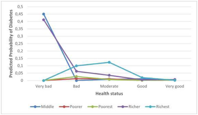 In predicting the prevalence of diabetes in Kenyan men, Table 1 shows the significant interaction effects of age and health status, health status and hypertension, and health status and wealth index.
