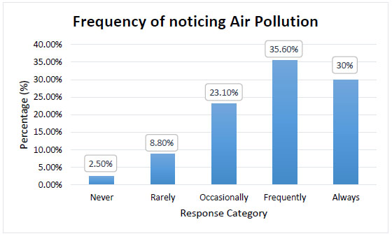 Figure 1 shows that participants were asked whether they noticed air pollution (smog, dust, or haze) in their area on a 5-point Likert scale ranging from 1 (Never) to 5 (Always). Most respondents favored frequently noticed air pollution (35.6%) or always (30.0%). Only 2.5% of participants declared that they never noticed air pollution. The mean response was 3.82(1.04), suggesting that, on average, participants noticed air pollution between “occasionally” and “frequently,” with a greater inclination towards “frequently.”