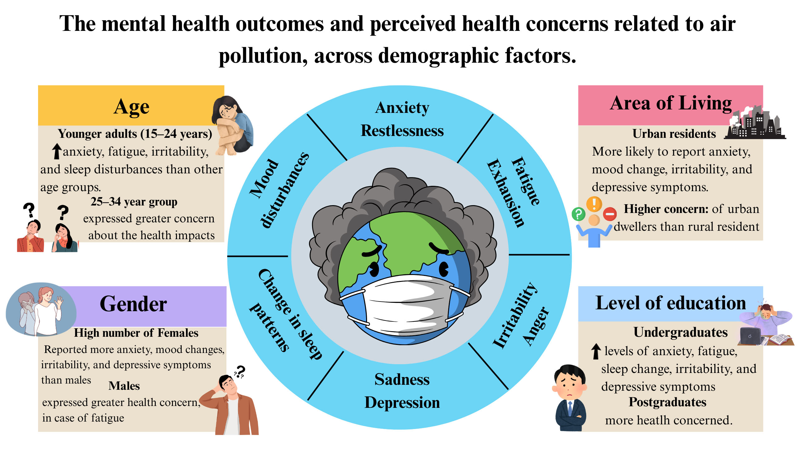 These findings show that polluted air in Pakistan significantly affects mental health, particularly among young urban females. The study highlights the awareness, health concerns, pollution sources, and self-coping strategies of the respondents.