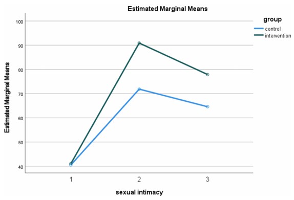 The graph of sexual intimacy in the intervention and control groups. 1: before intervention. 2: 8 weeks. 3: 12 weeks.