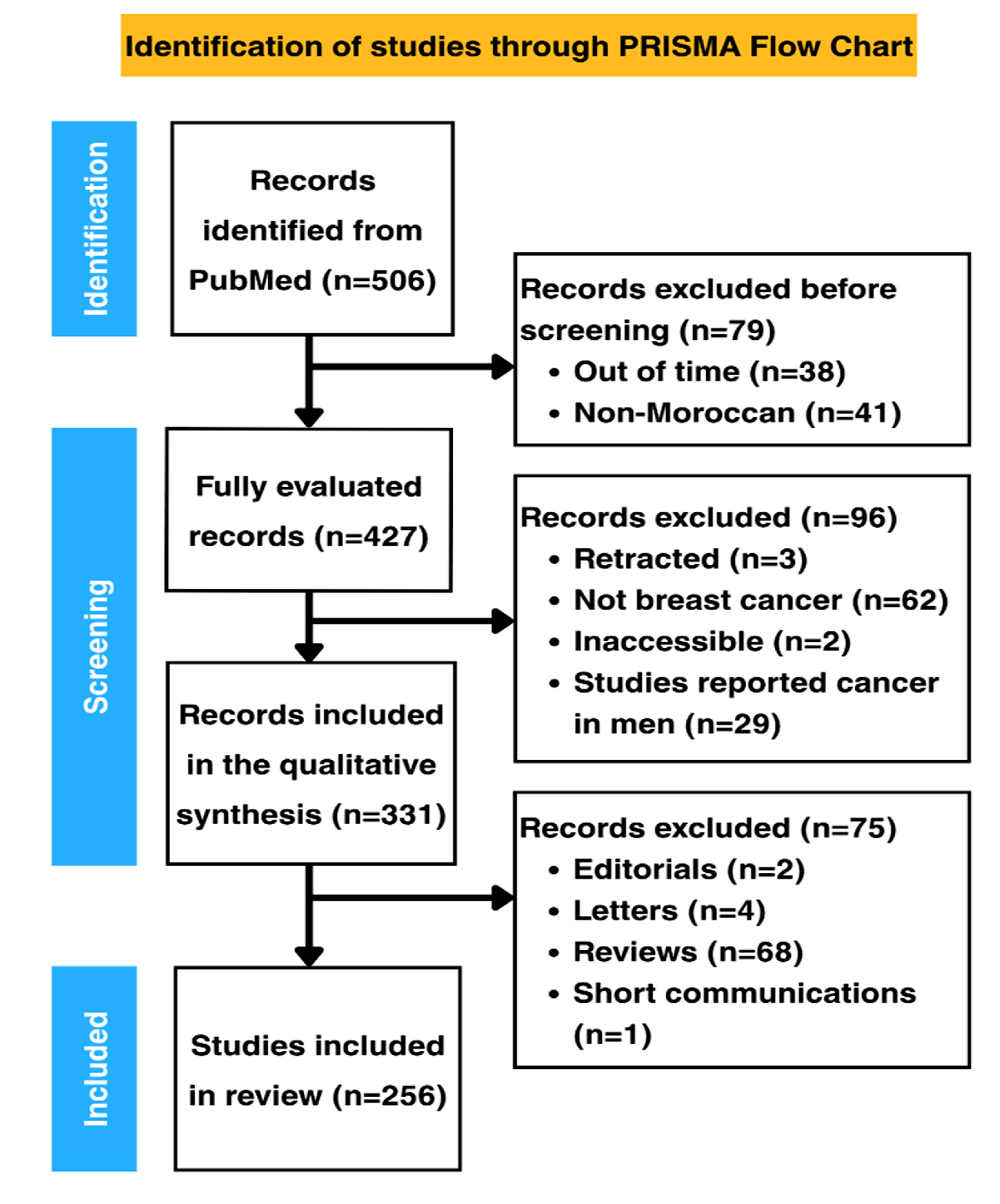 In total, we found 506 scientific publications that met the inclusion criteria. A total of 79 of them were out of time, or none of the authors are affiliated with a Moroccan institution. Next, we eliminated an additional 96 scientific publications due to their retraction, inaccessibility, association with male breast cancer, or lack of a primary focus on breast cancer. Only 256 scientific publications made the final cut (Fig. 1).