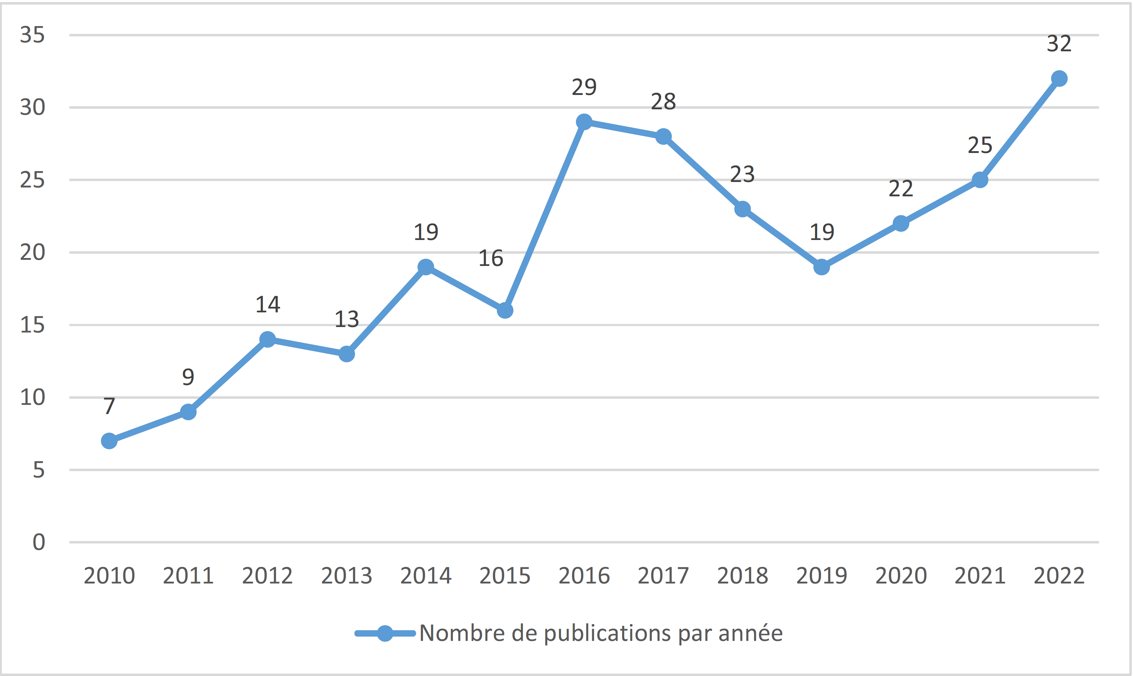We can distinguish two phases of evolution. First, between 2010 and 2015, the annual scientific production on breast cancer was relatively low, with a total of 78 publications over six years. Between 2016 and 2022, the annual scientific output experienced significant improvement, resulting in a total of 178 publications over the five-year period. We recorded a total of 256 publications over twelve years (Fig. 2).