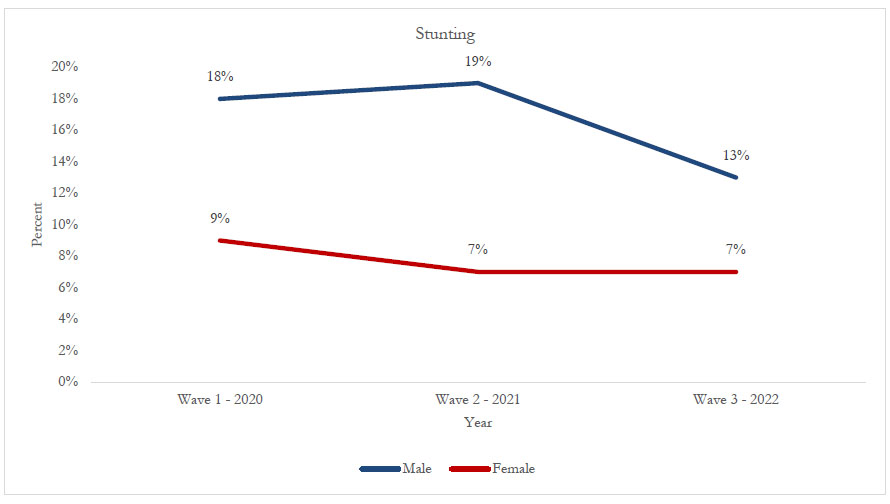 Figure 2 shows the trend distribution of stunting by sex. A reduction in stunting was observed in both sexes. For males, stunting decreased from 18% in 2020 to 13% in 2022, representing a 5% reduction. For females, stunting declined from 9% in 2020 to 7% in 2022, representing a 2-percentage-point reduction.