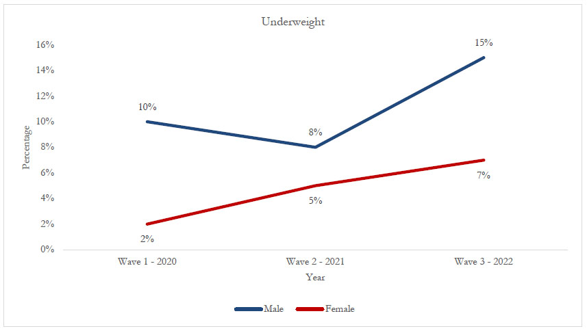 Figure 3 shows the trend distribution of underweight by sex. For males, the prevalence of underweight increased from 10% in 2020 to 15% in 2022, reflecting a 5% increase. Similarly, among females, underweight increased from 2% in 2020 to 7% in 2022, a 5% increase.