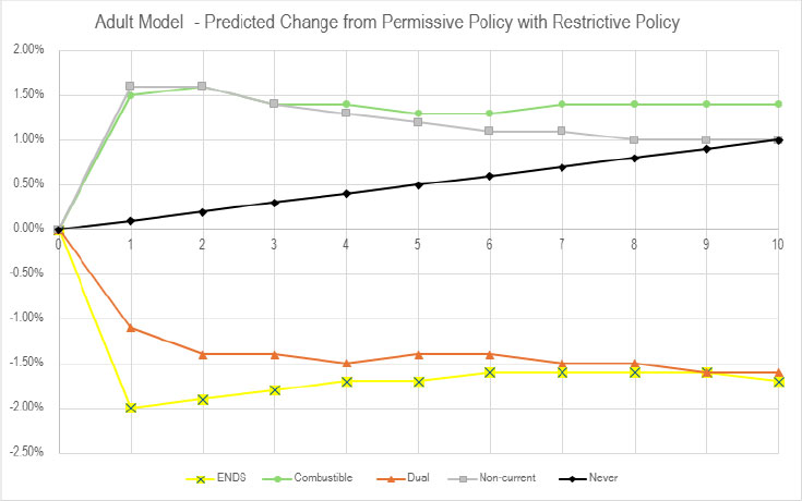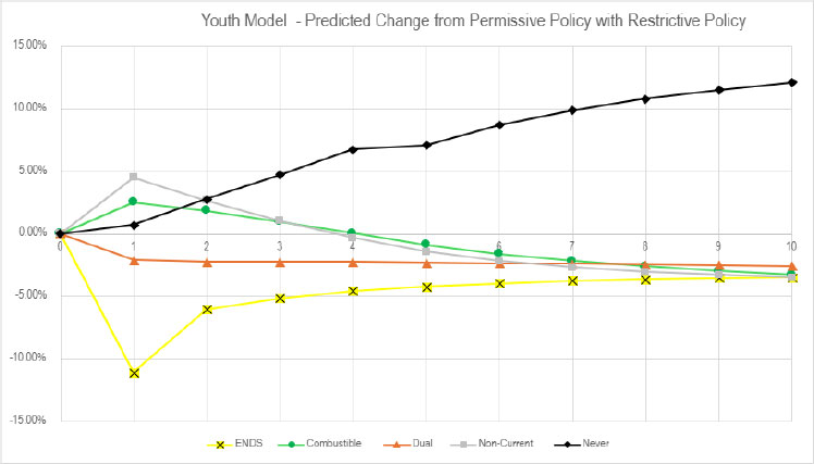 In the Youth Model, implementing a restrictive policy is predicted to result in an initial increase in combustible tobacco use compared to the permissive scenario, followed by a gradual decline over subsequent years, ultimately leading to a net decrease. We observed a similar trend for the Non-Current use state. The model predicts that the proportion of individuals in the Exclusive-ENDS and Dual-Use states declines sharply following policy enactment and stabilizes thereafter. Conversely, the Never-Use state is projected to increase consistently throughout the modeled period.