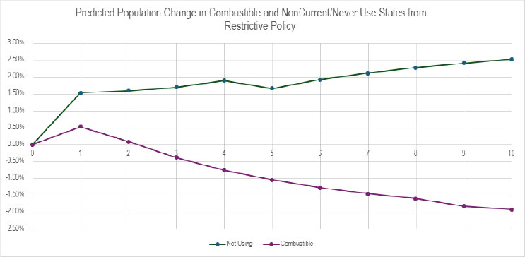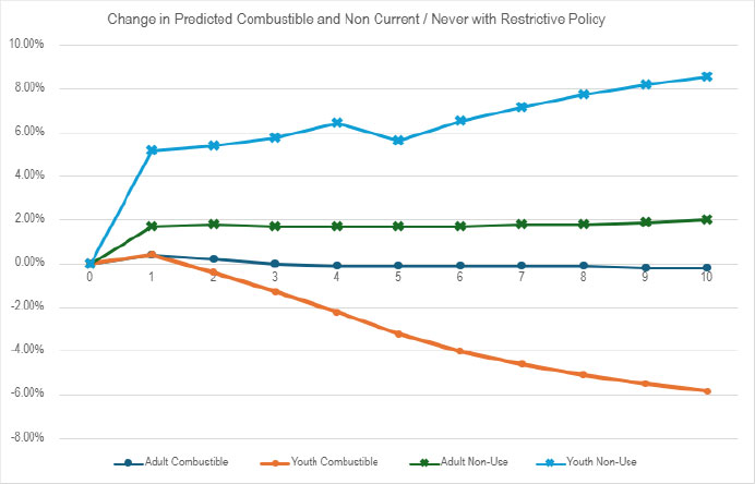 We demonstrated that a flavored tobacco restriction would see a short-term increase in combustible use from a substitution effect, before seeing a long-term downward trend in all tobacco product use is largely driven by a reduction in initiation among the youth cohort. Current users would see little to no long-term change in combustible use rates compared to a permissive flavor policy.