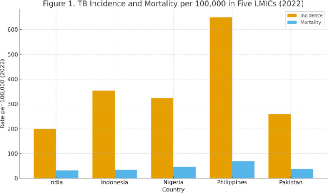 Tuberculosis (TB) is a persistent and deadly global epidemic. In 2022, the World Health Organization (WHO) estimated that 10.8 million people had TB. An estimated 1.3 million HIV-negative TB patients and 167,000 HIV positive TB patient deaths were recorded in 2022 [1]. Despite decades of global interventions and commitments, TB still ranks as the second-leading cause of communicable disease deaths after COVID-19 (1). LMICs bear a disproportionate burden of TB. Approximately 86% of global TB patients live in LMICs, with five countries-India, Indonesia, the Philippines, Pakistan, and Nigeria accounting for over 55% global TB cases (2). India reported about 2.8 million TB cases in 2022, representing 26% of the global TB burden [2]. In 2022, an estimated 467,000 people were infected with TB in Sub-Saharan Africa, calling attention to the crisis in the region [3]. High HIV co-infection, widespread MDR-TB, and systemic healthcare access disparities in LMICs frequently compound tuberculosis.