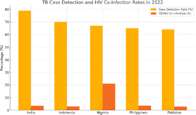 TB case detection and TB/HIV co-infection rates in five high-burden LMICs (2022). Case detection is the percentage of estimated TB cases that were diagnosed and reported. At the same time, TB/HIV co-infection represents the proportion of TB cases occurring in individuals with HIV infection-data source: WHO Global Tuberculosis Report 2023.
