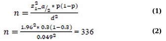 Using formulas 1 and 2 below, and considering a P-value of 0.3, which was estimated from a similar previous study [16], a confidence level of 95%, and a margin of error less than 5%, the sample size was calculated to be 336 participants.