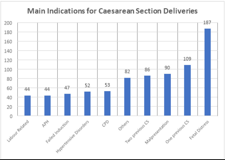 The analysis focused on determining the rate of CS among total deliveries and characterizing the main indications and immediate outcomes of CS deliveries. Baseline characteristics, such as indications of CS deliveries, for example, labor-related complications, CPD, fetal distress, and malpresentation, were described via counts, frequency, proportions, means, and percentages.