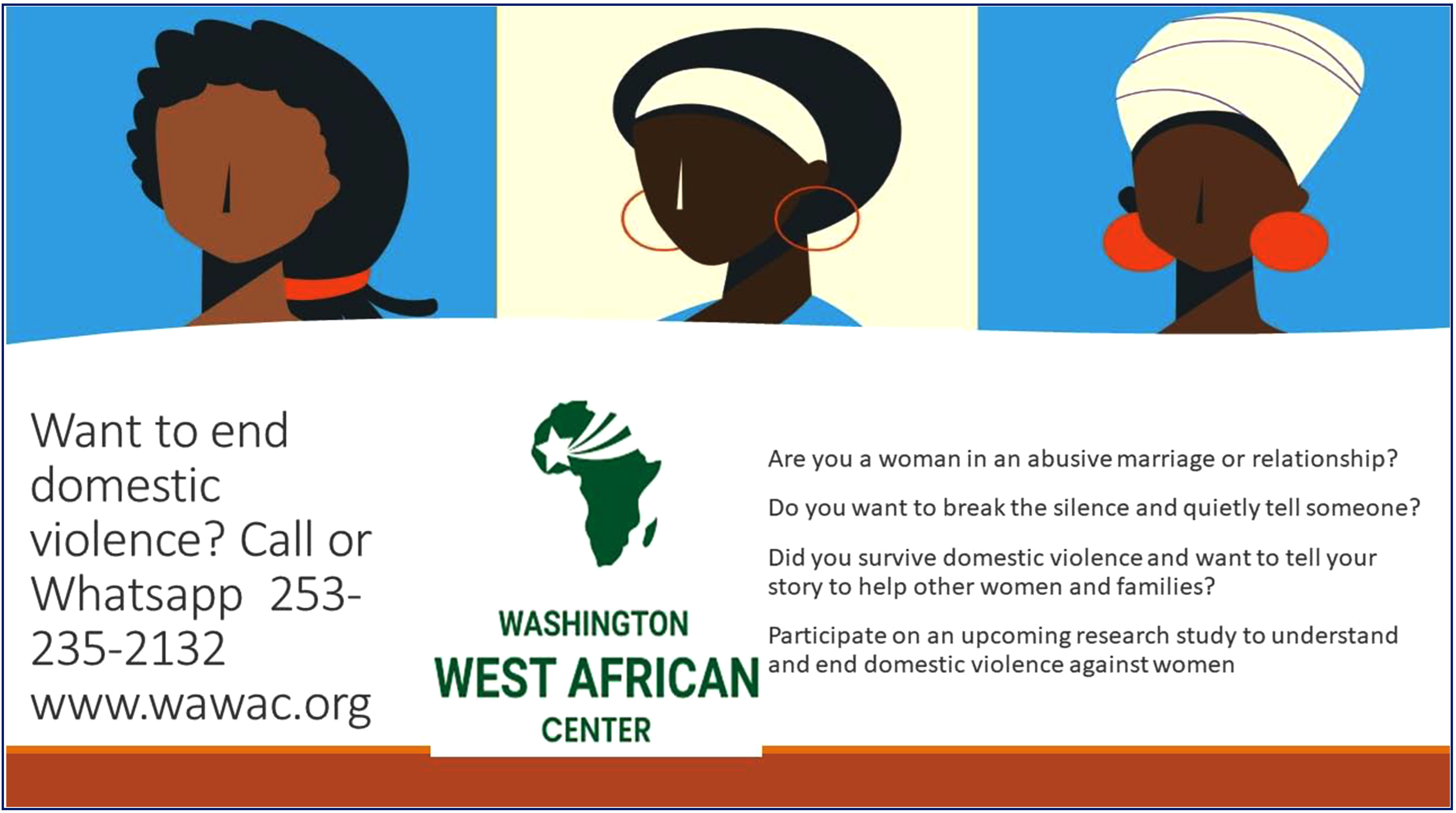 Long T, Yunusa R. HSERV 345 Community Health Assessment report for Domestic Violence in West African Immigrant Community of Washington State. 2023. Available from: https://wawac.org/research-studies-surveys/
