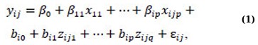where yij is an outcome variable that indicates the jth measurement on the ith subject, xij,j = 1, …, p are the predictor variables, β0,β1,…, βip are fixed effects, bi0, bi1,…, bip are random effects, zij’s are covariates for the random effects, and εij’s are random errors [1]. Assuming the outcome variable follows a distribution from the exponential family, it is not necessary to presume normal distribution for generalizing expression (1). In such cases, we can merge the mixed model concept with GLM, yielding a generalized linear mixed model (GLMM) [1, 22-24].