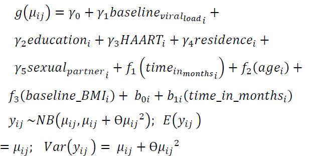 Here, yij denotes the vector of the response variable representing CD4 cell counts, g(·) is the log link function, and the outcome follows a negative binomial distribution with mean = µij and variance = µij + θµij2. The terms γi represent parametric regression coefficients, fi(xij) are smooth, nonparametric functions of the covariates X, and the random effects bi are assumed to follow a normal distribution with mean zero and covariance matrix Gθ, denoted as bi~N(0,Gθ) [1, 29, 32, 34, 40].