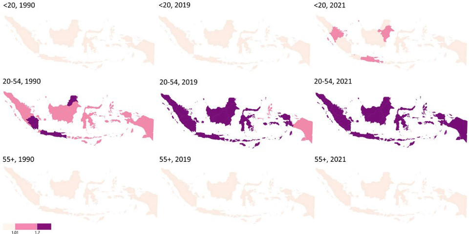 Overall, the spatiotemporal analysis indicates that the working-age population (20–54 years) consistently accounts for the highest levels of DALYs lost due to depressive disorders across Indonesian provinces.