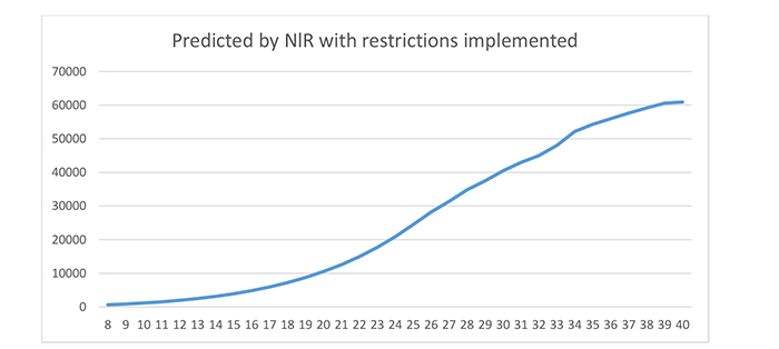 The model is straightforward and has been obtained with R software, by feeding it with daily observed data ranging from February 20th to March 13th, 2020. Two statistical scenarios on the possible diffusion of COVID-19 in Italy are presented here. In both of them, values for days 24 to 40 are the forecasted ones (ranging from March 14th to March 30th). The first model Fig. (1) is based on the pure non-linear regression equation underlined above. It does not take into account the restrictive measures adopted in Italy and therefore, it should not happen in reality, but it is useful to show what could potentially happen if no containment measures were implemented. There is a basic exponential trend, with a moderate contraction over time, which would lead to about 100,000 cases diagnosed within the thirty-fifth day from the beginning of the epidemic (i.e. March 25th, 2020).