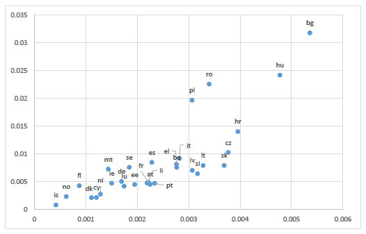 One of the most striking observations gleaned from this long set of Covid information is how much European countries have differed in terms of the Covid mortalities they experienced. Thus Covid mortalities were lowest in Iceland (is) with 0.00042 (or 153 deaths for a population of 364,134), while Bulgaria (bg) was highest with 0.00536 (or 37240 deaths for a population of 6,951,482). Germany (de) fell in the lower middle range with a Covid mortality rate of 0.00169 (or 141020 for a population of 83,166,711. These figures indicate that the experience of the Covid pandemic has been varied across Europe, with some countries being much more severely affected than others. If we were to take the extreme cases of Iceland and Bulgaria, Covid mortality rates would differ by a factor of more than twelve. Similarly, the chance of death from Covid in Bulgaria was thrice more than that in Germany. Suffice it to say that Bulgaria was not an isolated outlier in terms of Covid mortality. Other European countries with high Covid mortality rates included Hungary (hu, 0.004775), Croatia (hr, 003957), Romania (ro, 0.003399), Slovakia (sk, 0.003691), Czechia (cz, 0.00377), and Poland (pl, 0.003067). This was closely followed by Belgium (be, .002769) which had the highest Covid mortality rate among Western EU countries. Seen collectively, these figures are particularly puzzling, given the widespread availability of vaccines across Europe [2] which should have created more of a level playing field. They suggest that national healthcare systems and behaviours impacted significantly on Covid mortality levels (Fig. 1).