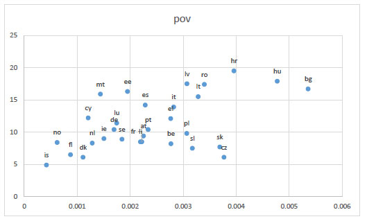 Following this analysis, we explored the relationship of poverty rate data of OECD-reported country with the country’s Covid mortality rates. The OECD defines this rate as the ratio of the number of people (in a given age group) whose income falls below the poverty line; taken as half the median household income of the total population [9, 10]. Such a relationship was considered, not only because European countries with high Covid mortalities were at the poorer spectrum, but also because research from other countries indicated a relationship between poverty and high Covid mortality rates [10]. As shown in Fig. (5), this relationship was not very strong, with only a mildly discernible upward slope.
