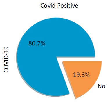 On the other hand, Fig. (5) illustrates the same data using a pie chart format. This visualization offers a clear and concise depiction of the proportion of patients with positive and negative COVID-19 results relative to the total number of patients. The pie chart format allows for easy comparison and understanding of the relative frequencies of each test result category.