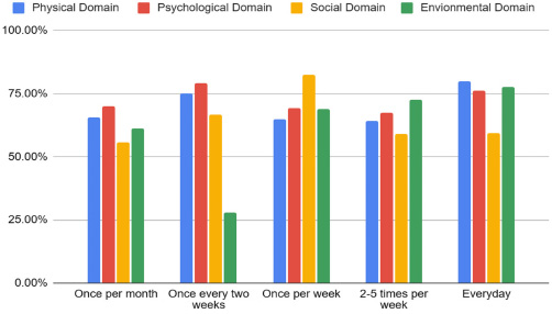 Table 2 indicates that an increased frequency of participation leads to an increase in QoL based on the different domains included in the questionnaire. Six individuals participate in aquatic activities once per month with a QoL score of 63.11; one individual participates once every two weeks with a QoL score of 62.24; eleven individuals participate once per week with a QoL score of 71.47; twelve participate two to five times per week with a QoL score of 65.77; and three participate every day with the highest QoL score of 73.33. An increase in the frequency of participation leads to a strong QoL mean increase in the Environmental Domain. Table 2 shows the following results: Once per month (61.25), Once every two weeks (28.13), Once per week (71.47), 2-5 times per week (72.40), and every day (73.33). The descriptive statistics (mean ± SD) and percentage of the QoL (physical, psychological, social, and environmental domains) of participants partaking in different activities are present in Fig. (2) and Table 3. The mean score and standard deviation for each domain were computed for each type of aquatic activity.