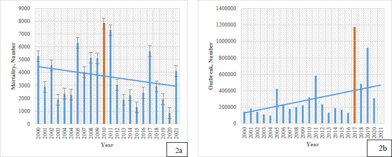 Number and trend of cholera mortality in the worldwide during 2000-2021 (according to WHO data).