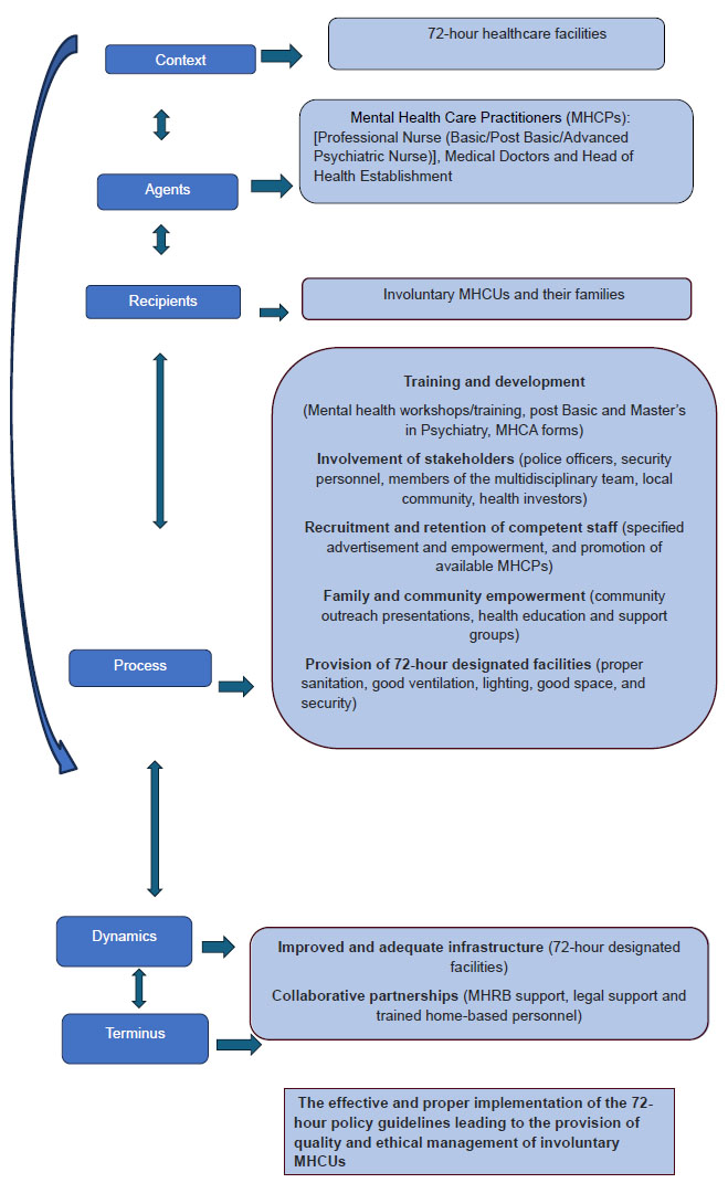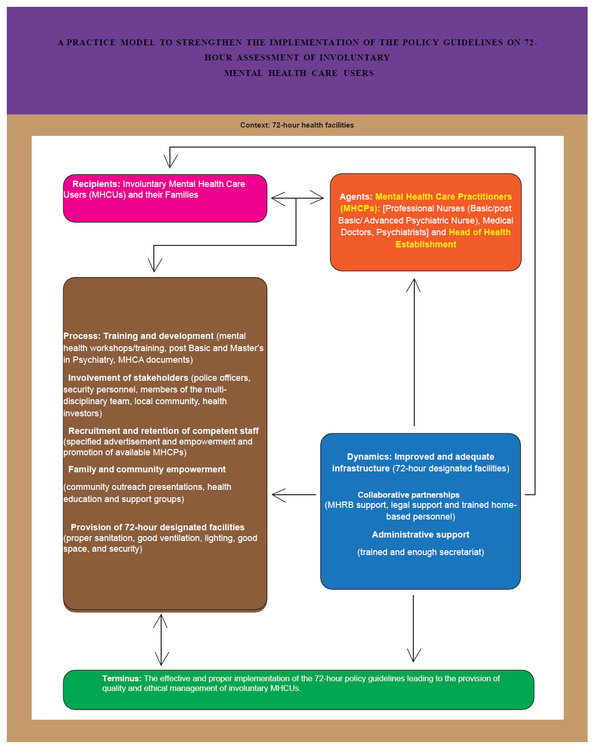 Consensus was reached, identifying the main themes of the model as follows: recipients, involuntary mental health care users and their families; agents, mental health care practitioners and heads of health establishments; process, training and development; stakeholders’ involvement, including recruitment and retention of competent staff, family and community engagement, and provision of designated 72-hour facilities. The dynamics encompass improved and adequate infrastructure, collaborative partnerships, and administrative support. The ultimate goal of the model is the proper implementation of the 72-hour policy guidelines.
