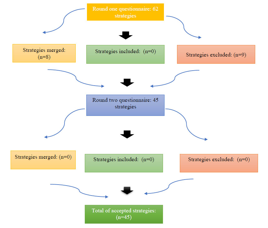 A complete audit trail mapping all 62 Round-1 items to the final 45 strategies (including merged, renamed, or excluded items) is provided in Table S1. Face and content validity of the initial Delphi questionnaire were reviewed by five senior experts from among the 12 panelists, based on their extensive professional experience (over 10 years), prior to Round 2. The study was approved by the Ethics Committee of Saveh University of Medical Sciences (IR.SAVEHUMS.REC.1401. 015).
