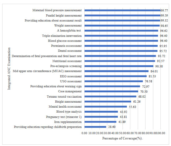 For the product components, the integrated ANC results in this study were 79.74%, exceeding the 75% standard for good service quality. According to the definition of good quality ANC, a health service facility must provide 75% of the required services, such as physical exams, basic diagnostic laboratory services, drug therapy, danger sign information, childbirth preparation, and advice [9]. Other research found that only 4% of pregnant women received all recommended antenatal services. Standardized ANC strongly affects maternal and fetal health during pregnancy, childbirth, and postpartum [22]. Pregnancy-related health service implementation faces more than accessibility issues. Service quality must be improved, especially to meet all pregnant women's health needs [27]. Examination coverage based on the components of integrated ANC is above average, but not all examinations are completed. This needs quality improvement to meet minimum standards. Providing high-quality, evidence-based maternal health services that meet local needs and overcome new barriers is crucial [10].