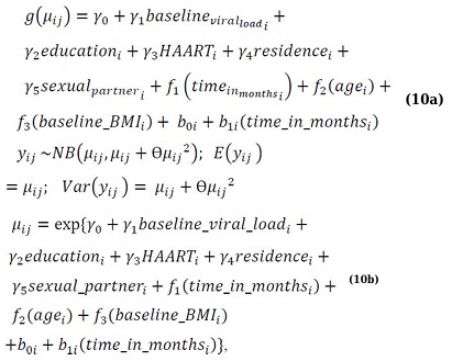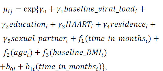 Here, yij denotes the vector of the response variable representing CD4 cell counts, g(·) is the log link function, and the outcome follows a negative binomial distribution with mean = µij and variance = µij + θµij2. The terms γi represent parametric regression coefficients, fi(xij) are smooth, nonparametric functions of the covariates X, and the random effects bi are assumed to follow a normal distribution with mean zero and covariance matrix Gθ, denoted as bi~N(0,Gθ) [1, 29, 32, 34, 40].