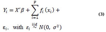 Where Yi represents a response variable vector, X’ represents a model matrix that includes all strictly parametric model components, β represents the corresponding parameter vector, fi(·) represents arbitrary univariate and smooth (nonparametric) functions, one for each covariate xj, and εi represents random errors [1, 37]. To ensure that these are smooth functions, xix_ixi can be estimated under standard conditions, such as having an expected value of zero (E(fi(xi))=0E(f_i(x_i)) = 0E(fi(xi))=0). These functions are estimated nonparametrically rather than specified in a parametric form [35]. Consequently, the additive model (AM) can accommodate nonlinearity in covariates that are not the primary focus of the study and adjust for their effects accordingly [1, 30].