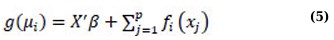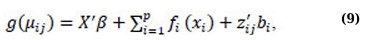 where again, each fi(·) is an unspecified smooth function. The model’s flexibility is increased by using a nonparametric form for the functions fi(·), but the additivity is still maintained, making it possible to interpret the model similarly to the GLMM form. One of the examples of a GAMM is the additive negative binomial mixed-effects model [48].
