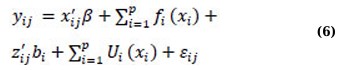 where the variable β is a p × 1 vector of coefficients associated with covariates xij, and fi(·) refers to twice-differentiable smooth functions of time or nonparametric fixed effects. bi includes independent q × 1 vectors of random effects’ coefficients associated with covariates zij. Ui(·) is an independent and smooth random-effects process, and εij is an independent measurement error that occurs at a time tij, which cannot be explained by either the fixed-effects component (x’ijβ + ∑ip=1fi(xi)) or the random-effects component (z’ijbi + ∑ip=1Ui(xi)) [46]. In general, SMMs consist of four major components: parametric fixed-effects (x’ijβ), nonparametric fixed-effects (fi(·)), parametric random-effects (z’ijbi), and nonparametric random-effects (Ui(·)). In their work, Wu and Zhang [47] presented a comprehensive analysis of various types of semiparametric mixed-effects models by examining different scenarios where one or two components of the model (expressed in equation (6)) are dropped. For instance, if the nonparametric random-effects component is removed from SMM (6), the resulting model is expressed as equation (7) below, which is equivalent to incorporating the random-effects into the additive model (3), known as the additive mixed model (AMM):