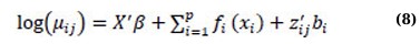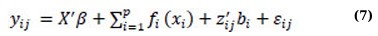 where X’, β, fi(·), zij, bi, and εij are defined as in (3) and (6); εij~N(0,R) and bi~N(0,Gθ). Both covariate matrix R and Gθ are positive-definite matrices depending on a parsimonious set of covariate parameters [32, 34, 40]. The AMM expressed in equation (7) can be thought of as a combination or hybrid of linear mixed models and additive models [48, 49].