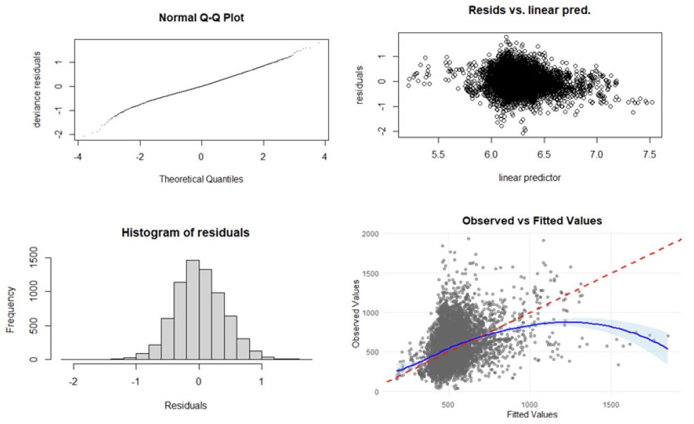 GAM extends both multiple linear regression models and GLMs, enabling the modeling of outcomes from the exponential family, including continuous, discrete, count, and proportion data. GAMs offer flexibility and are used to better understand and analyze complex, nonlinear relationships within data. They effectively characterize key features of the relationship between the response variable and the covariates by using smooth functions, such as splines, which allow for a broad range of functional forms [1]. To fit a GAM, one can use the gam function from the mgcv package in R. When fitting a GAM, the covariate (X) needs to be included in the s (smooth) function to specify a flexible relationship. The flexibility of splines allows GAM to capture various nonlinear aspects [1]. The flexible smooths in GAMs are made of many smaller functions called basis functions. Each smoother is the sum of several basis functions, and each basis function is multiplied by a coefficient, which is a parameter in the model. With GAMs, it is possible to include a mixture of smooth, linear effects, continuous, counts, or categorical variables in a multiple regression model format. Not all terms in a GAM have to be nonlinear, as it is possible to combine linear and nonlinear terms. Adding a linear term does not require repelling the predictor term in the s function. Linear terms are particularly useful when we have categorical variables as predictors in the GAM [1].